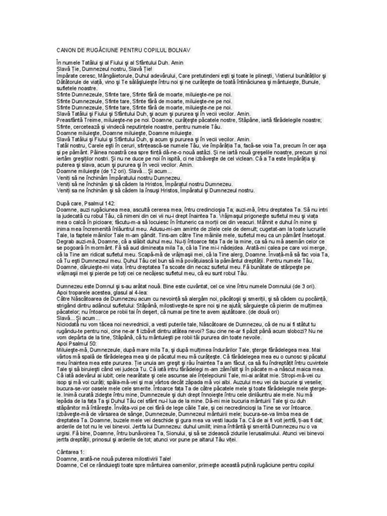 În numele tatălui și al fiului. În numele tatălui şi al fiului şi al sfântului duh. Canon de rugăciune pentru copilul bolnav. În numele tatălui și al fiului. Te rugăm, doamne, vindecă durerea acestui copil, robul tău (numele). Împărate ceresc, mângâietorule, duhul adevărului, care pretutindeni eşti şi toate le plineşti, vistierul bunătăţilor….. (de trei ori cu tre.