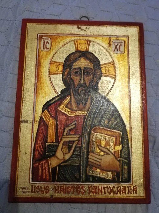 17, 5 x 21, 5 cm. Cuvântul provine din limba greacă și se traduce prin „atotstăpânitorul" sau „atotțiitorul". De pe bolta turlei fiecărei biserici ortodoxe, iisus hristos, reprezentat ca pantocrator, îi binecuvântează pe cei ce intră cu credință în sfântul său locaș.așezarea acestei icoane în cel mai înalt loc din biserică are legătură cu numele de „pantocrator". Icoana pe ou îl înfățișează pe iisus pantocrator redat bust înalt, binecuvântând cu mâna dreaptă şi ţinând în stânga evanghelia închisă. Posted by icoane pe sticla under iisus hristos.