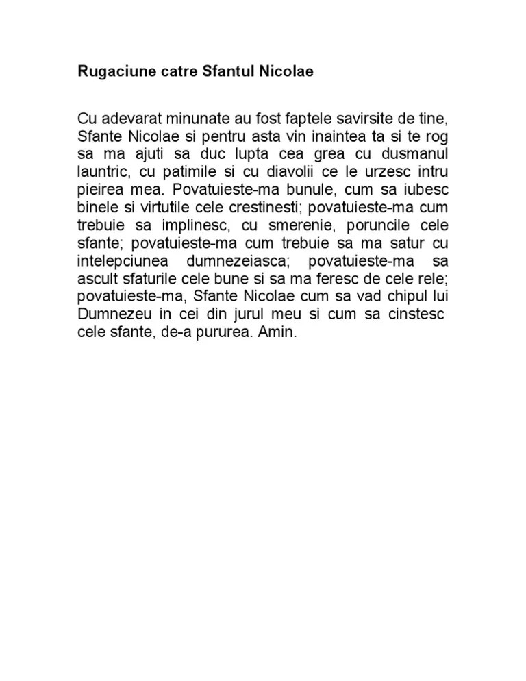 Rugaciune catre sfantul nicolae o, sfinte parinte nicolae, mare facator de minuni, ocrotitorul si daruitorul celor nevoiasi, pe cei ce cu buna nadejde. . 05.12.2016 · ziua de sfântul nicolae, 6 decembrie, nu înseamnă numai cadouri, ci și un moment de rugăciune.