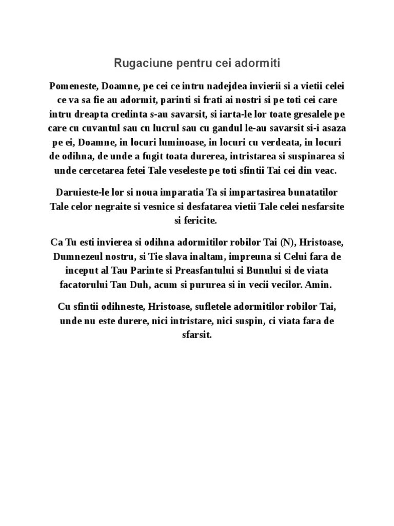 Rugaciune catre dumnezeu tatal pentru cei adormiti o, preasfanta doamna, de dumnezeu nascatoare, catre tine preacurata nazuim. . Pomenește, doamne, pe cei ce întru nădejdea învierii și a vieții celei ce va să fie au adormit, părinți și frați ai noștri și pe toți …